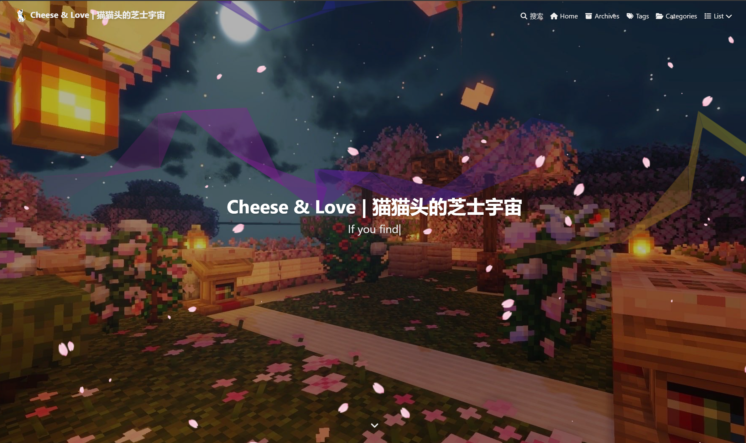 封面一图流参考了Formalhaut的教程( 博客魔改教程总结(一) | Fomalhaut🥝),使用了鲷鱼猫和奶酪猫寒假一起玩mc时拍的照片,是樱花别墅里最好看的一张!